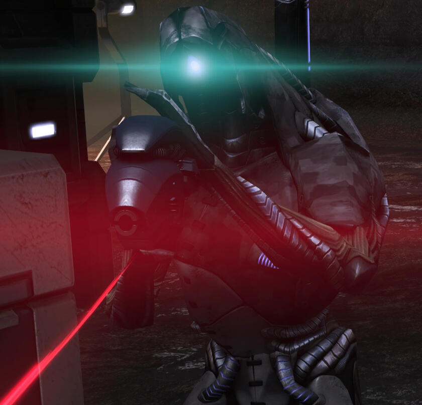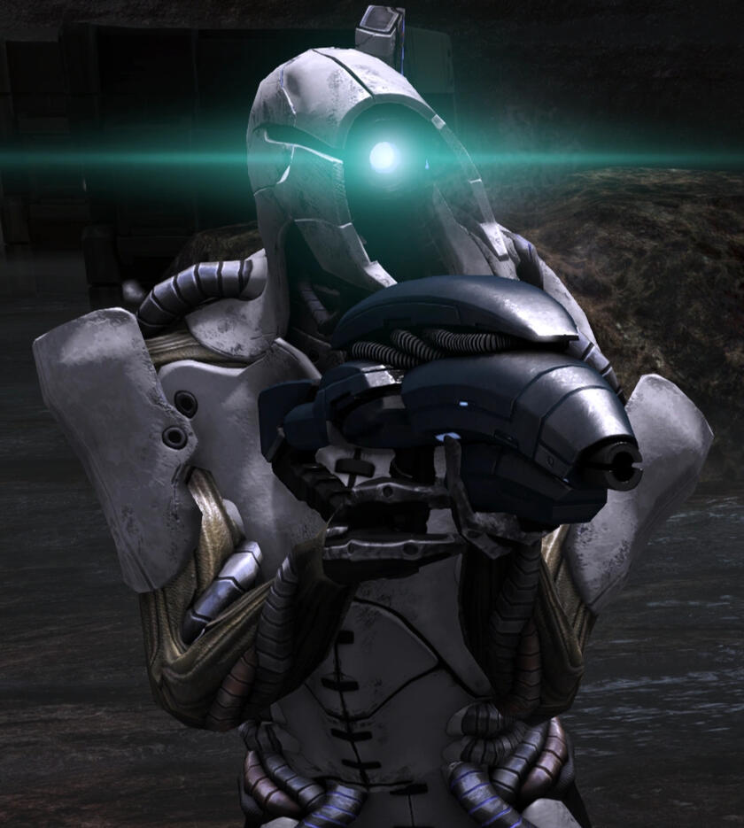 GETH. The geth ("Servant of the People" in Khelish) are a race of networked artificial intelligences that reside beyond the Perseus Veil. The geth were created by the quarians as laborers and tools of war. When the geth became sentient and began to question their masters, the quarians attempted to exterminate them. The geth won the resulting war, and reduced the quarians to a race of nomads. The history of the geth's creation and evolution serves as a warning to the rest of the galaxy of the potential dangers of artificial intelligence and to the legally enforced, systematic repression of artificial intelligences throughout galactic society.Physically, the humanoid geth resemble quarians—their hands, head shape and legs are similar—which is probably a holdover from their origins. A common design feature among geth is a single brightly glowing photoreceptor, causing some to refer to them as "flashlight heads". Geth are primarily composed of two materials: a flexible but durable outer shell, and a kind of synthetic muscle tissue that gives Geth Hoppers their incredible agility. It is actually possible for this synthetic muscle to be grafted to organic tissue. Geth "bleed" a white conductive fluid when shot, but they don't have any internal organs or nervous system, so the geth do not feel hunger or pain. The geth are also seen using omni-tools, and have seemingly modified them to heal synthetic wounds; likewise, some geth facilities contain first-aid kits, implying that their synthetic "tissues" can be repaired using conventional medical technology.Part of the geth's success is due to their neural network. Effectively, they "share" their processing power, distributing low-level processes like motor control and visual identification to free up bandwidth for higher reasoning and complex thought. Geth can't share sensory data—they aren't a hive mind like the rachni—but in large groups they have more to think with. An individual geth has only a basic intelligence on par with animal instincts, but in groups they can reason, analyze situations, and make tactical decisions as well as any of the organic races.Each geth is made up of hundreds of programs equivalent to VIs, all operating in parallel with one another to form a kind of emergent intelligence described as "a thousand voices talking at once".