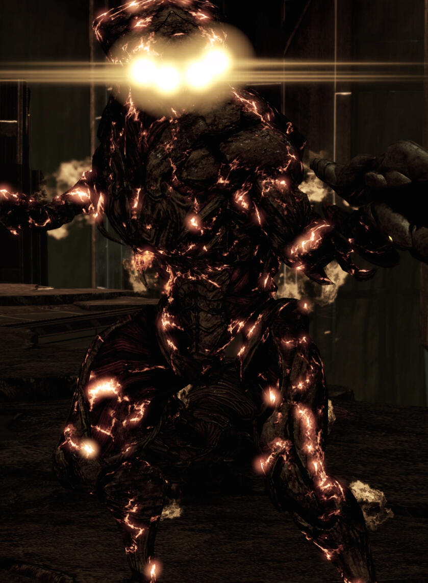 GETH DESTROYER. Geth Destroyers are one of the larger and more dangerous forms of geth infantry, frequently encountered wherever there is a notable concentration of geth. They are more durable and deadly than most geth infantry, and should be handled with caution. The Geth Destroyer is a fearsome enemy, standing eleven feet tall. Their armor is dark grey with a yellow stripe down the middle of the chest, and they have a bright blue 'flashlight' eye. The Destroyer carries a Geth Pulse Shotgun, and possesses strong health and shielding. Some Destroyers are armed with the M-451 Firestorm flamethrower which is extremely lethal at close ranges. As their weapon range is limited, they will attempt to get close to their opponents.